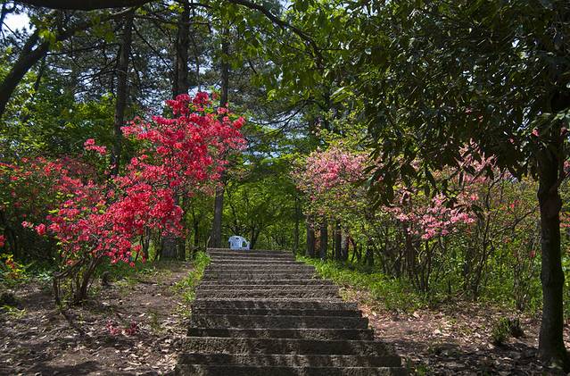 缆车站有免费存行李服务,缆车往返160元。花台景区是九华山风景区观景的最佳地点,时值5月高山杜鹃点缀,蓝天白云,山峦起伏,奇石林立,漫步在环形栈道上令人心况神怡。环形栈道到头是向上的石阶,可以爬台阶到花台观景台回到缆车站,我们为了保留体力便沿原路回到缆车站。若是体力好可以沿山路一直陡步2-3小时左右到天台景区。