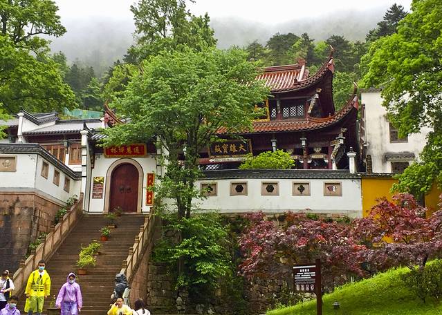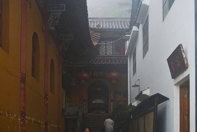 雾大且空间小,没有好机位。在这里花了35元买了个拐杖,便开始向上爬800多个台阶。由于昨天走的比较快,膝盖不适,今天慢慢走感觉还可以。本来想只要能远远看见天台寺,拍个照片就可以了,但沿着拐来拐去的台阶上来,等看见天台寺时已是没有多长台阶了,便一鼓作气地上来了。今天走得慢,虽然台阶远比昨天的多,但膝盖并没有昨天那么难受,看来以后一定注意让自己的脚步慢下来,才可走得更远。