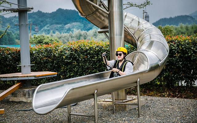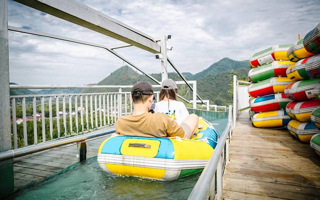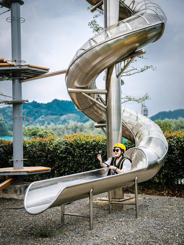行走在生仙里竹溪探险乐园里,总会被各种自然风光和互动体验项目吸引,从栈道出来继续走上一小段路,就能看到这里的玻璃漂流,这也是竹溪探险乐园里一座高空悬架的720度旋转玻璃水滑道,可以说是整个景区里最为惊险刺激的一处体验项目,也是此行我最期待的项目啦。