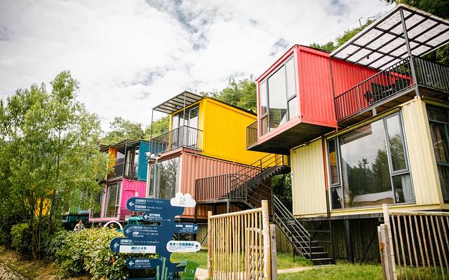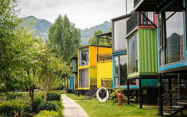 如果是来生仙里竹溪探险乐园度假,建议一定要住一晚在水一方这个集装箱主题组建而成的民宿,河畔的这个网红民宿由很多个集装箱搭建而成,而这39个彩虹色的集装箱外部则被涂成七彩的颜色,内部被设计成各种主题房型,每个箱子就是一个房间,酷炫极了!