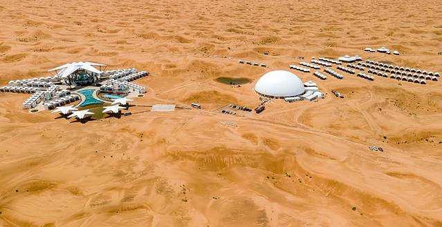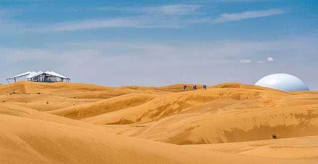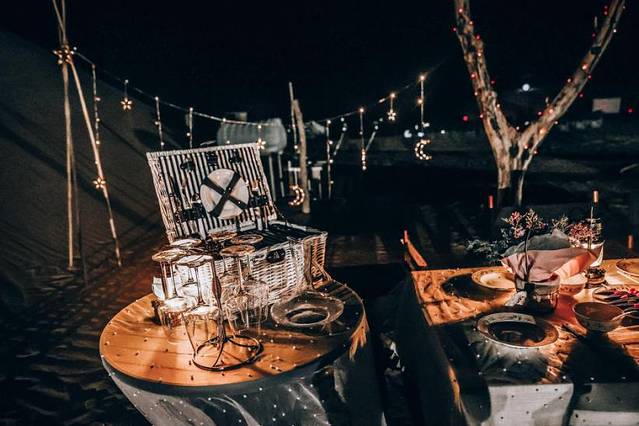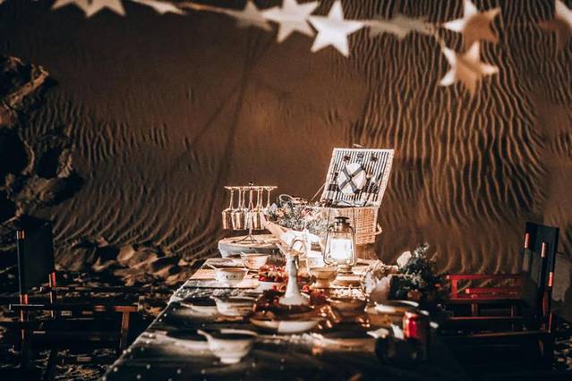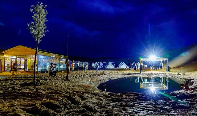 大漠营地的占地面积很大,帐篷搭在两个沙丘之间的谷地,在住宿区域四周则是众多的娱乐项目,比如滑沙、骆驼、沙漠秋千等等,因为我到达的时候已经天黑,所以就没有去玩这些项目,不过营地的网红餐桌真是美哭了,随手一拍都是大片,喜欢拍美照的小仙女们一定不能错过。