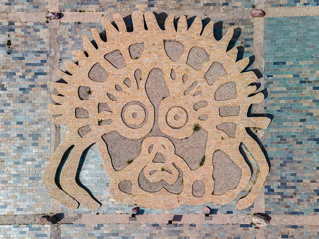 走进景区,首先看到的就是铺在中央大道的太阳神雕塑,这也是贺兰山岩画的代表,大家在景区里多个地方都能看到这个符号。