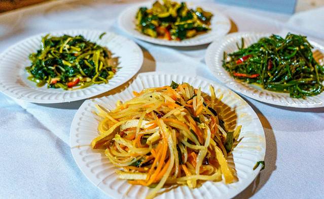 大漠营地的晚餐主打烧烤,在正式上菜之前每桌会有四个凉菜,如果一个人过来的话就要和人拼桌一下。