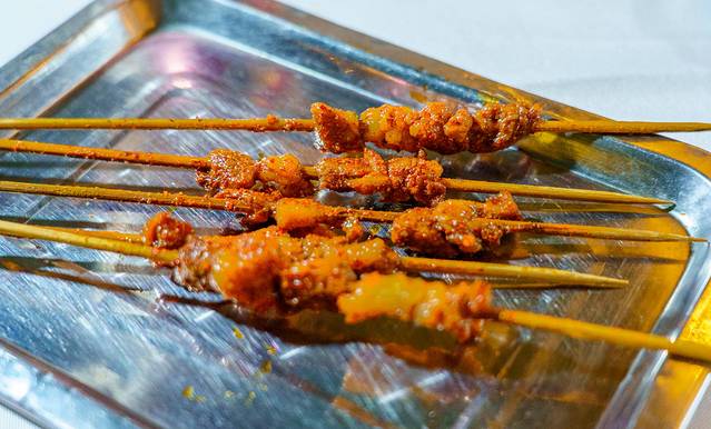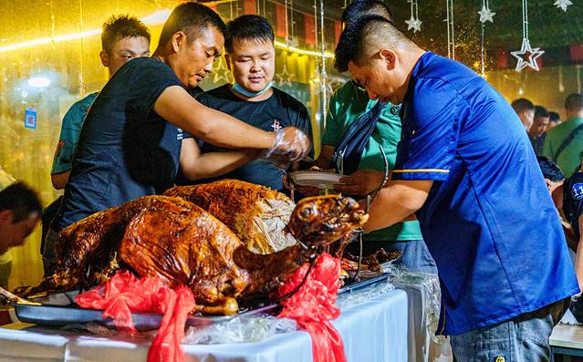 不得不夸一下这里的烤肉串,真的是很正点,基本上属于上一把马上就吃光一把的水平。整个晚餐的高潮点在上烤全羊的时候,三头烤全羊一起端上来,还有顾客亲自剪彩、开刀仪式,玩得很欢快吃得也很嗨。