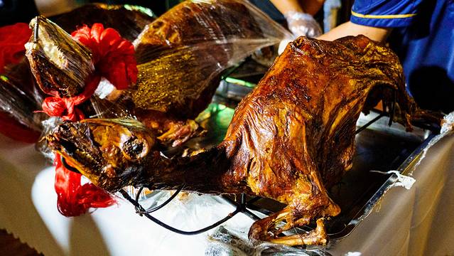 美味的烤全羊,沾上辣椒粉简直是绝了,特别是这个烤得酥脆的羊皮,我给十分,不怕老板骄傲~