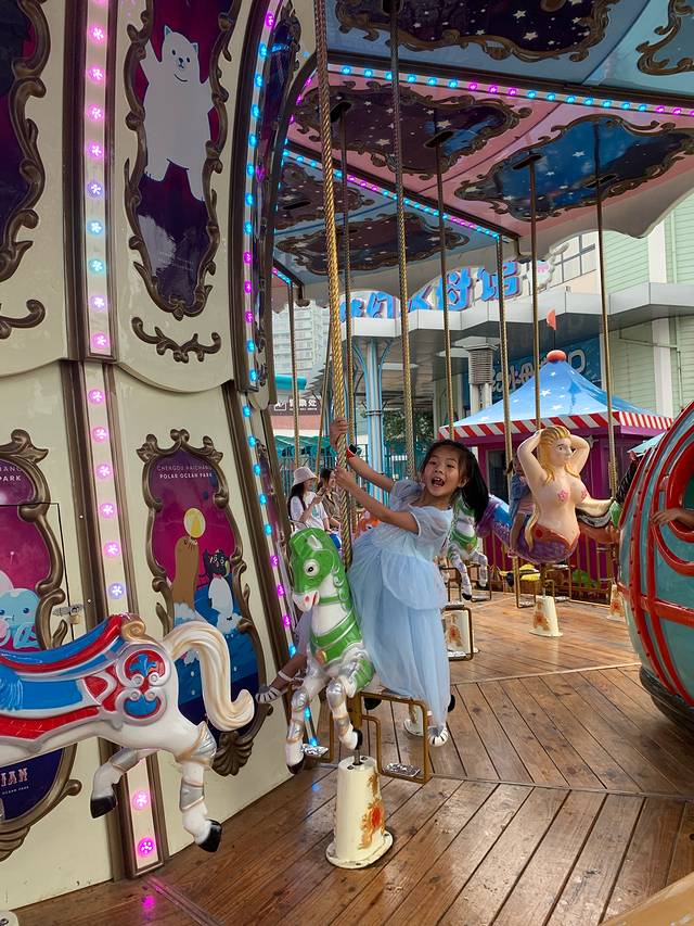 海洋馆门票,提早网上预定,成人229元儿童179元,到达检票口出示身份证,儿童有身份证号码就可以验票通过。雨还没有停,稍微小一点,这一天推车解决了很多问题,二宝的游玩和睡觉都轻松解决。进门关注一下公园的二维码获取演出时间表,按时间游玩就可以了。门口有免费乘坐的旋转木马,海盗船等。三三两两的游客,大宝坐了好几次,坐完想坐的造型。一天下来大家都累坏了,一进入地铁两个娃都要睡觉,小宝背在身上睡,推车就成了大宝的卧榻,满足的睡了一个好觉,地铁轻松解决了回程的问题!