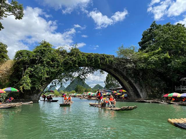 今天是自由行,在酒店定的遇龙河漂流,早上会有车在门口接送,时间太长了,记不清具体多少钱一个人了,好像是200多。如果行程不太急,建议体验一下竹筏漂流,真的是不枉此行