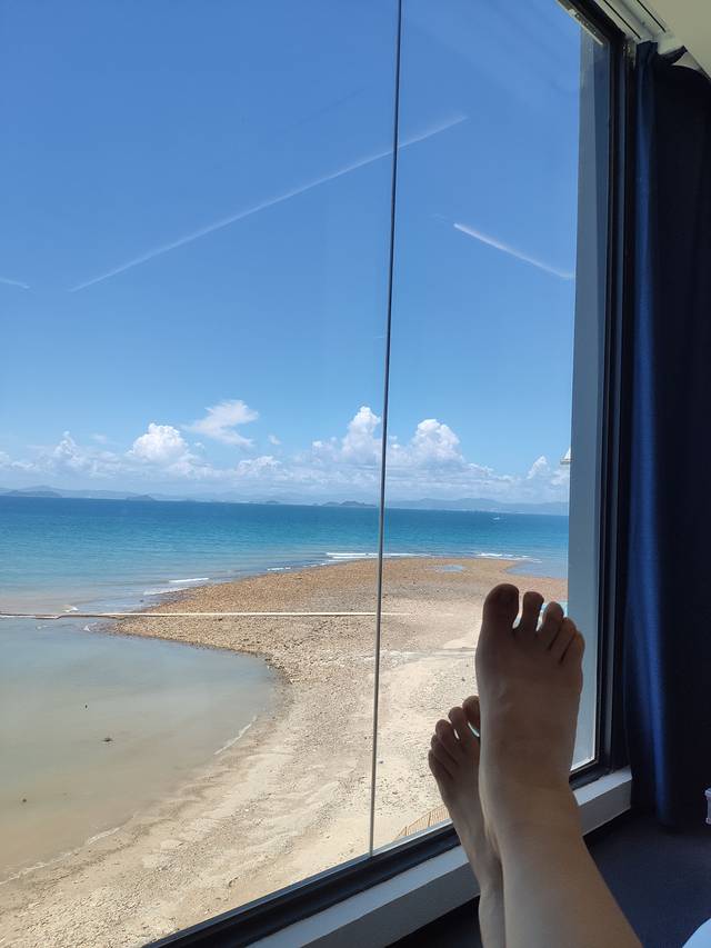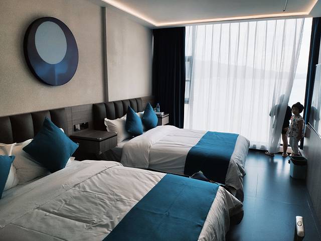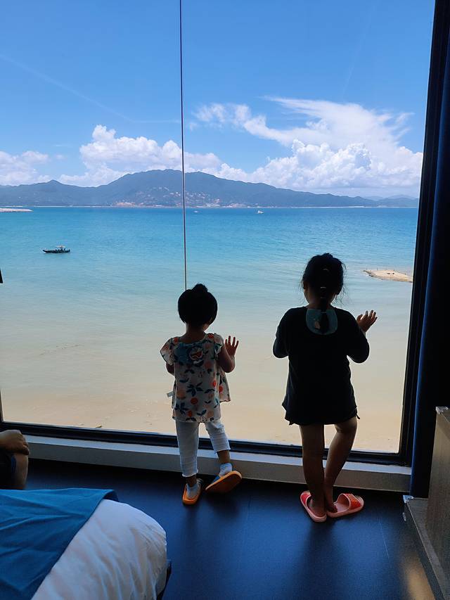 我们住在四楼,海景套房有个榻榻米休闲区,可以喝茶看海,简直太美了,孩子在上面爬来爬去,玩得挺开心。自动窗帘,正对大海,一眼就喜欢了。