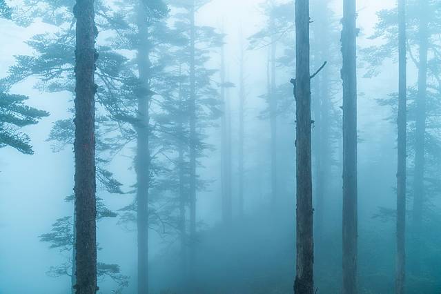 在大雾笼罩下,仿佛步入了仙境,道路两旁若隐若现的杉树林,浓雾中每一棵都那么神情魅惑。是不是随时都要从树林中飘过一个得道仙人?
