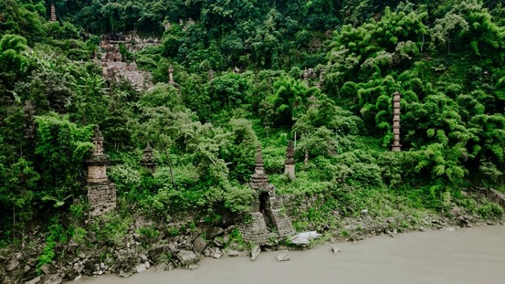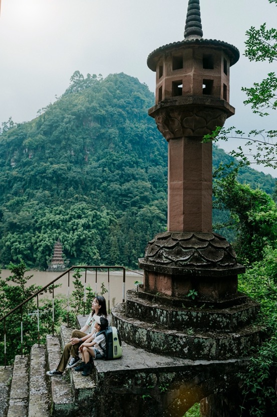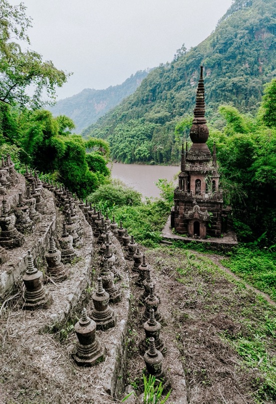 一条清澈如玉的青衣江则伴着北纬30度线蛇形斗转,在洪雅县槽渔滩镇形成一个长约112公里的深峡湖泊。20多年前的槽渔滩风景区曾经红火过,因为上游修水库导致景区部分古建筑和景点消失,风景区无人管理后虽然很多景点荒芜了,不过景区的森林葱茏依旧,明清遗留的少数古迹留存,长满苔藓的众多佛塔和古寺在经历了无数风雨和多年沉寂后,呈现出与众不同的古老沧桑美,成了年轻人喜欢的“探险”打卡地。