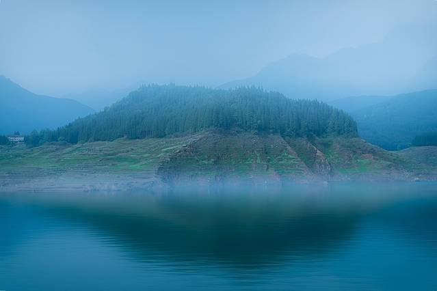 雅女湖是我所见湖泊中最美好,最有镜的湖泊。周边群山环抱,湖水波光鳞鳞,清晨,霞光正照雄伟瓦屋山,倒影映之湖水中,几叶扁舟荡漾湖面。瓦屋山山麓重迭错落有致,一团团轻云从山麓深涧、深谷冉冉升起,在山间、山腰、湖面轻轻地飘荡……飘荡……