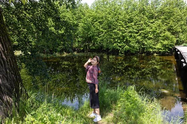我们停靠在小山头,这个上坡是向下的,花草开得特别茂盛,路边还有个凉亭。这个角度也类似于上帝视角,乌哈尔河湿地的景色一览无余。但一定要谨防脚下打滑,旅行途中始终牢记安全是第一要义!