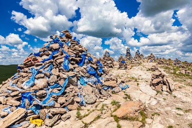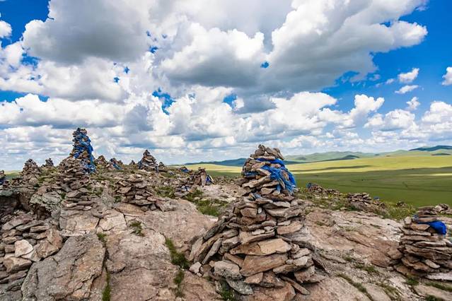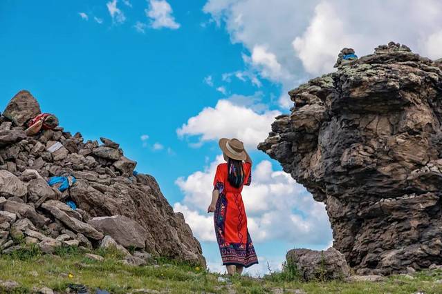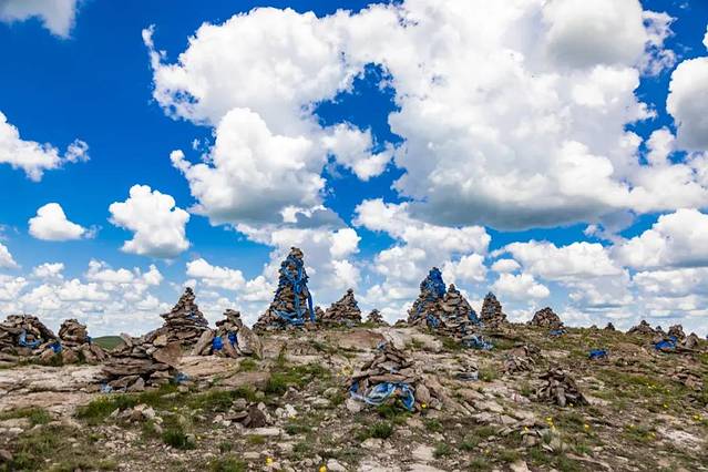 其实也就是一处石头坡,不算高大,上面堆了不少石头,石碓上又缠上了这边的蓝色经幡,一眼望去还是挺壮观的!石头坡不高,坡度也挺缓,完全可以爬上去的,在这俯瞰大草原的视角也很不错。