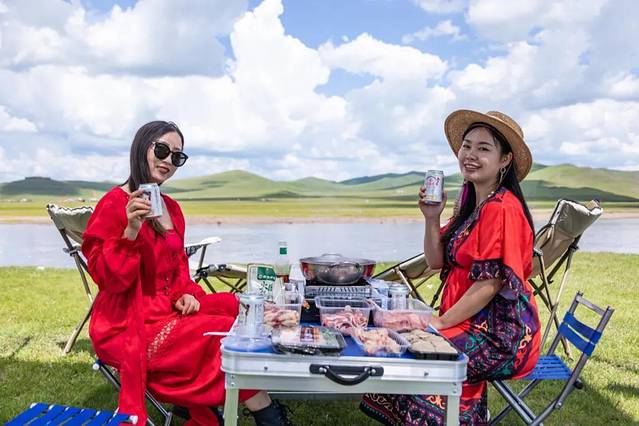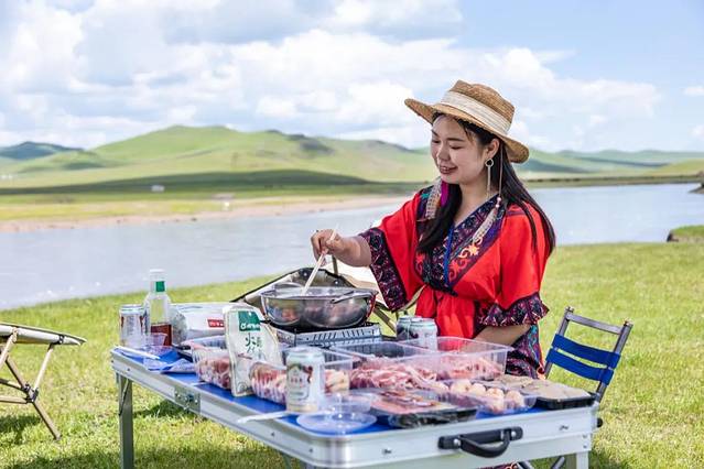 在遮阳伞的庇护下,河边涮火锅的我们特别惬意,耳畔是淙淙流水声、间或听到附近牛羊的叫声,还和着草原上风声,嘴里吃的是最好吃的牛羊肉,喝的是海拉尔啤酒,闻到的是火锅的馨香!