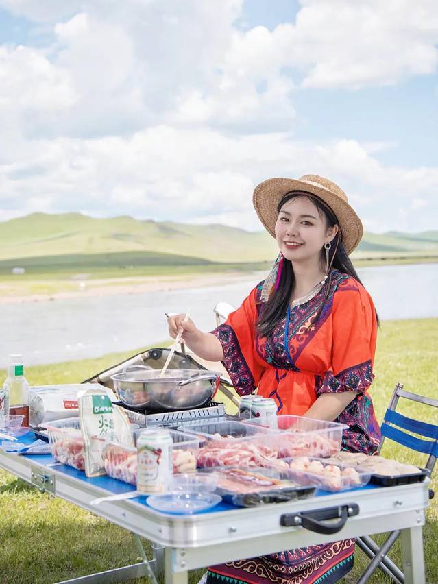 从山坡上下来,我们开车到了河边,高哥和同行的小哥开始支遮阳伞,准备午餐了!我做梦也没想到在呼伦贝尔大草原上,我们居然能涮火锅!现在回想起来,都觉得这事儿我可以吹一辈子~真的得感谢高哥,提前准备好了火锅底料、蘸料,买好了牛羊肉和涮菜,这一顿火锅的味道,这辈子都忘不了!
