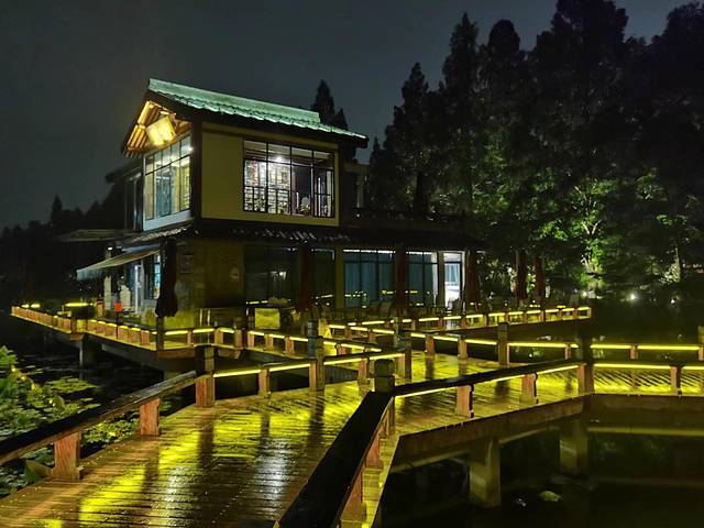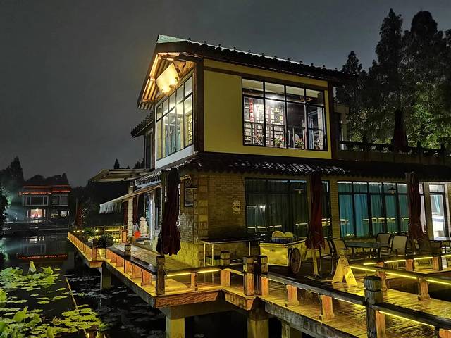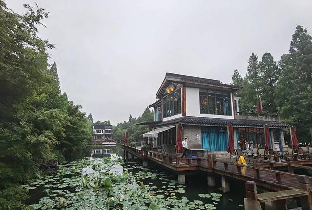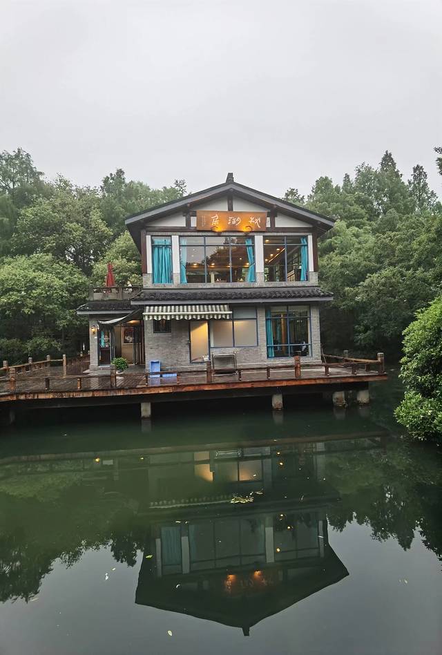 这是百年老店知味观,在西湖边新开设的一家园林式湖景餐厅,它前拥山水、后挹湖光,小桥流水、曲径通幽,6幢风格迥异、新颖别致的独立式小楼,明珠般点缀于湖光林荫间,特么的美妙,当夜间灯火璀璨、霓虹闪烁时,更是特么的美妙。