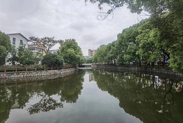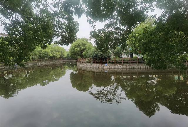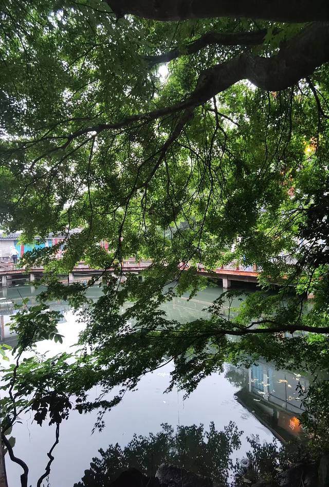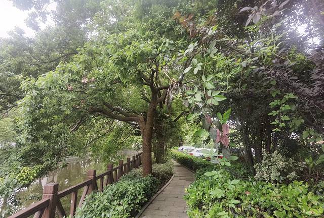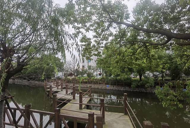 围绕着河道,是一条曲曲弯弯的步道,两岸葱绿的大树、掩映着的民居,还有潺潺的水流声、风吹过时的树叶声,给人一种宁静的感觉,要不是远处桥上隐隐约约的来往汽车,打断了这种感觉,一直保持着这种感觉还是挺清凉爽快的。