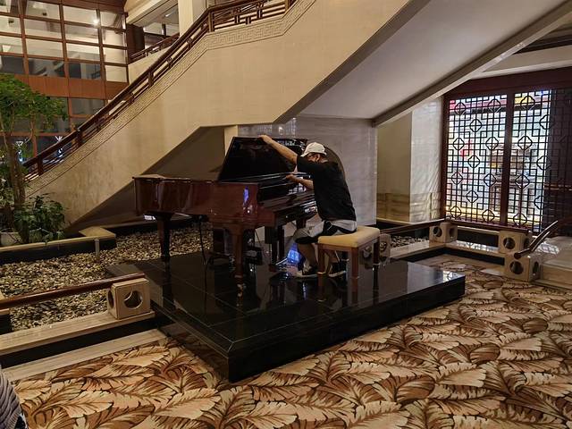 二是它时尚。花园里有露天茶座,大堂里有景观咖吧,可以喝茶、喝咖啡、小坐聊天,花园、大堂里的中式庭院风格,也是挺时尚的,拍大片也是很出彩的,大堂里还有一架钢琴,很牛掰的几个小姐姐上去露了一手,赢得阵阵掌声,我只能干瞪眼,装模作样摆个pose呗,拍出来后都说我一点都没“钢琴家”的范儿,倒像个“修钢琴”的,“修钢琴”的也不错哈,好歹也算个技术活,是吧!