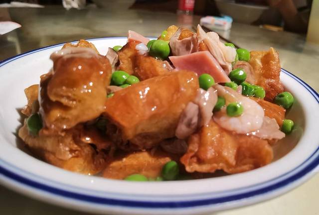 面馆里的菜谱挺丰富的,各种小吃、小菜、小酒性价比挺高的,挺亲民的。我有个坏习惯,出门在外吃饭时,老是喜欢看别人的盘子,看别人吃些啥,然后问一下“好吃不?”然后把自己馋得哈喇子直淌。看到隔桌上了一道老油条,色迷看上去很不错,喔喔,我要吃!点呗!