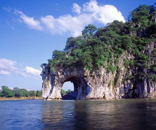 象鼻山,桂林市城徽山,传说大象走至漓江边喝水,被这秀丽的山水迷住,挺在了岸边,再也没有离开。大象的鼻子弯出的弧度与漓江形成两轮圆月,一轮在水面之上,一轮在水中~构成了象山水月的奇景。