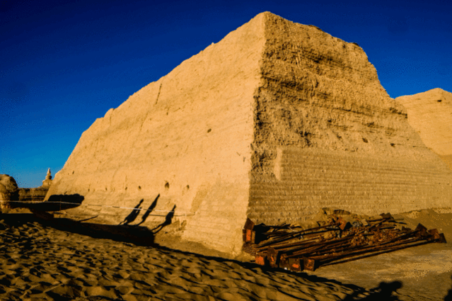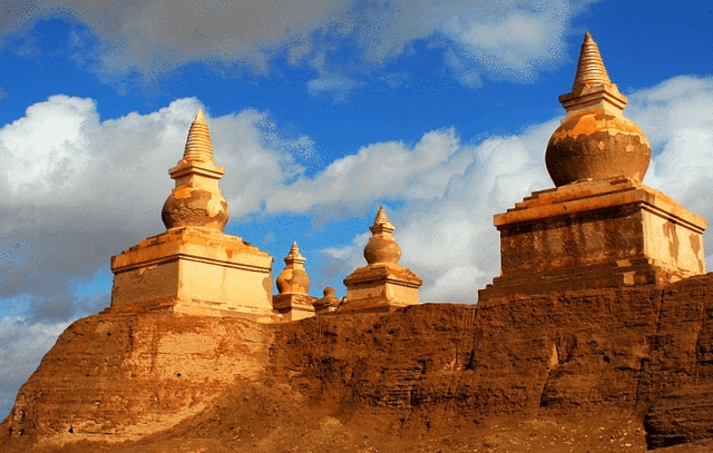 天空碧蓝没有一丝云彩,黄沙一片漫无边际,沙丘中出现一个略有起伏的轮廓,几尊残塔耸立其中,那是黑水城遗址的标志。