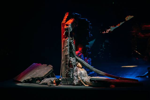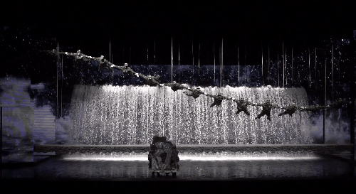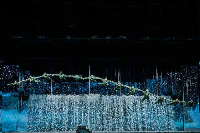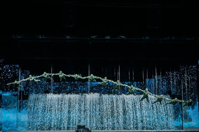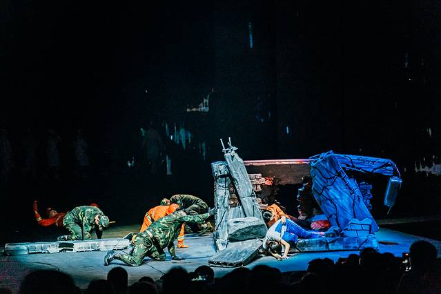 而且舞台的设计相当巧妙,上一秒滚滚“洪水”袭来,让人身临其境,而下一秒场景转换,洪水褪去,整个舞台瞬间又是另外一番模样。