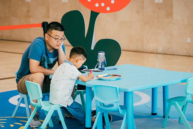 在《欢乐艺术工坊》,小朋友可以和家长一起来给恐龙上色,是难得的亲子互动时光。