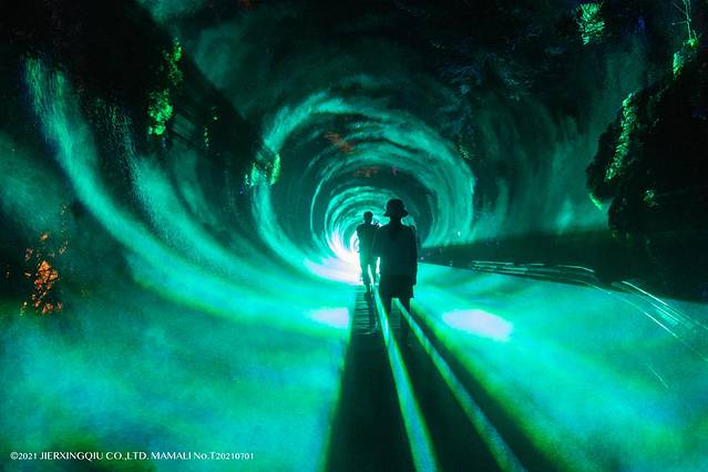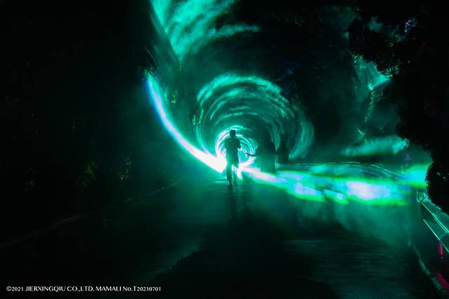 然后是时空穿梭,利用激光与雾森营造了一道巨大的光影漩涡,道路两旁铺满雾气,缓缓地走进时空隧道,细雨霏霏柳眼开,云烟缭绕似仙台,开启感受仙山秘境。