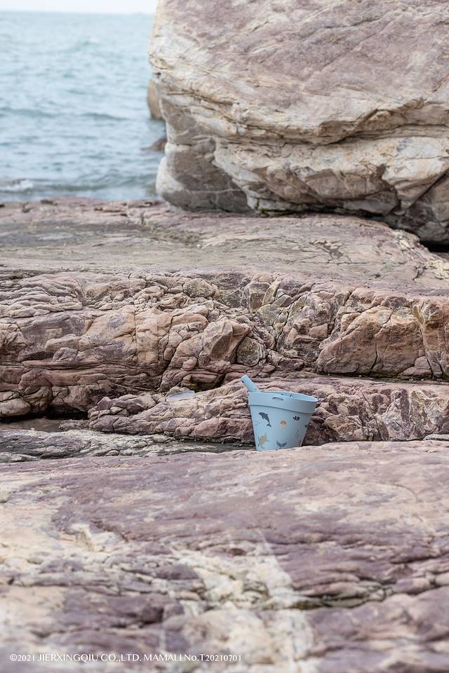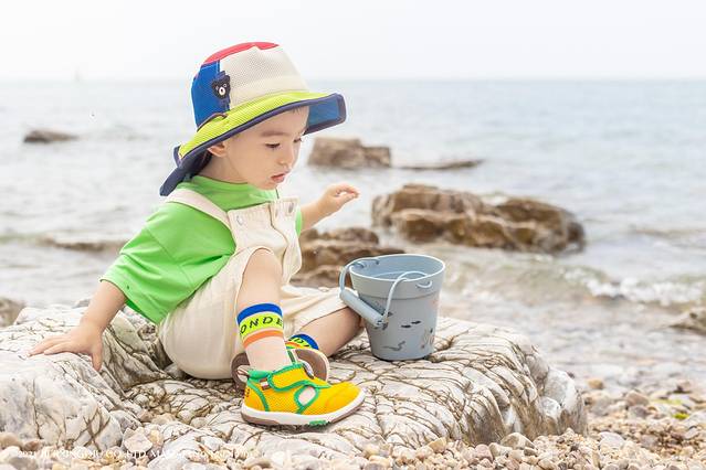 当然,他最喜欢的还是海边的小石头,看到自己喜欢的就装进小水桶里,一路走一路装,不一会就把整个水桶装满。