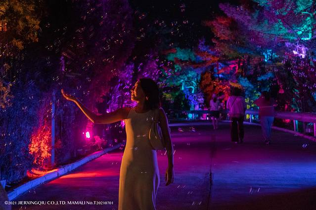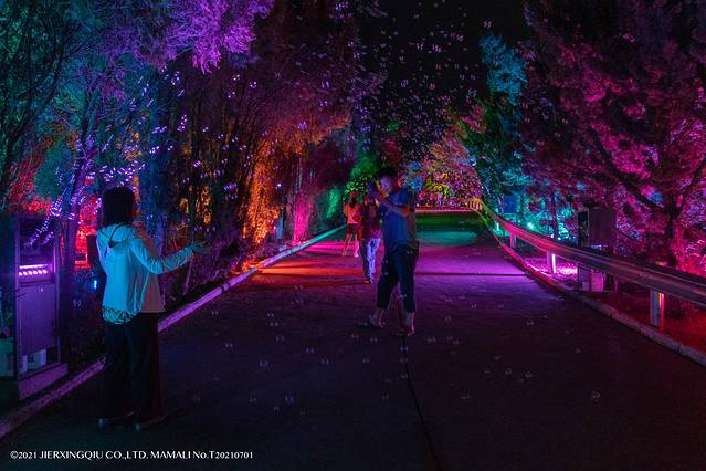 首先会步入梦幻仙林,琳琅满目的七彩泡泡漂浮在空中,恍若梦境。