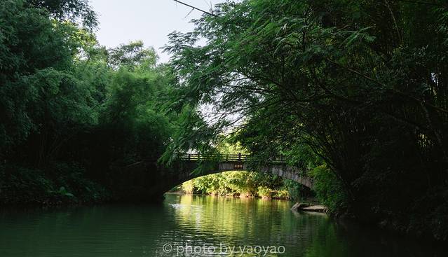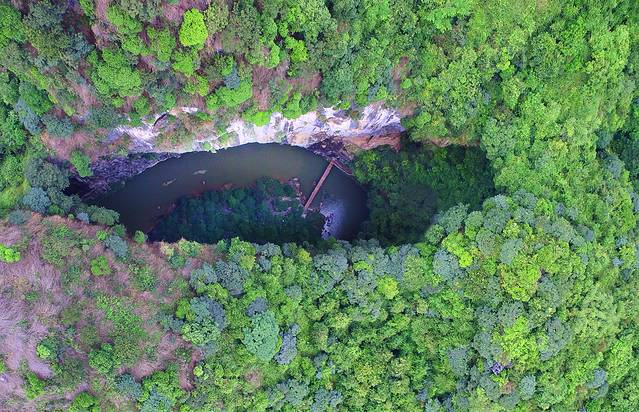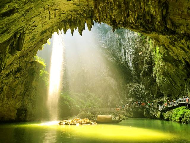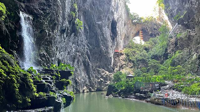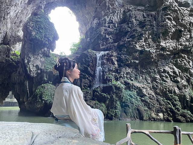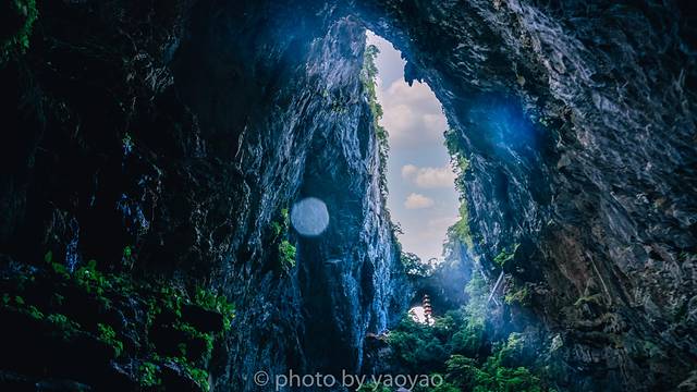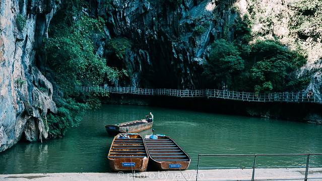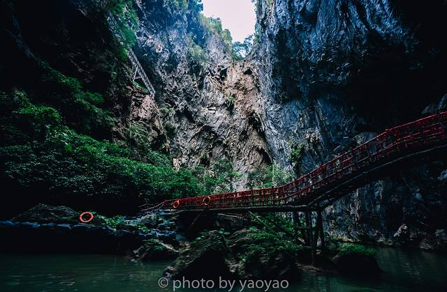 洞内有洞,洞底有河。船只穿过一段狭窄的地方进入到洞内,视野豁然开朗,远处的竹林、桥、各种不知名的绿植映入眼帘,宛如闯入桃源般世界,洞内的水、林、光、石完美呈现出清、幽、静,如一副天然山水画,直让人惊叹出声,“别有洞天”可能就是这样一意境吧!