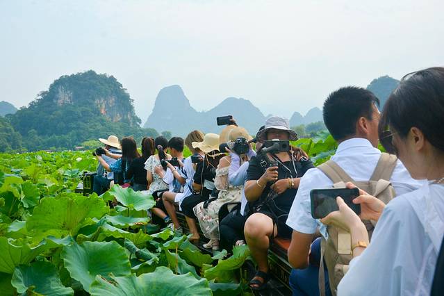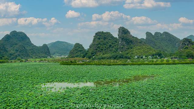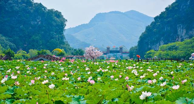 行走在峰林小镇内,你会闻到阵阵的荷花香味。原来是莲湖里的荷花已悄然盛放。每年的6月到9月,九龙峰林小镇300亩荷花迎来了绽放期。远远望去,翠绿无垠。朵朵荷花傲然挺立,与峰林、长廊......浑然一色,非常好看,最适合用镜头捕捉啦!