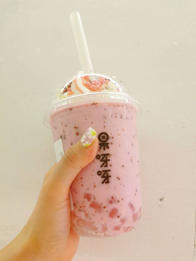 果呀呀,比茶颜悦色还能搞到。茶颜悦色门店超多,选家等候人数少的再排就好。好不容易找到3家,终于喝上,点的是草莓小公主,味道像奶昔,好喝,值得一试。