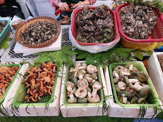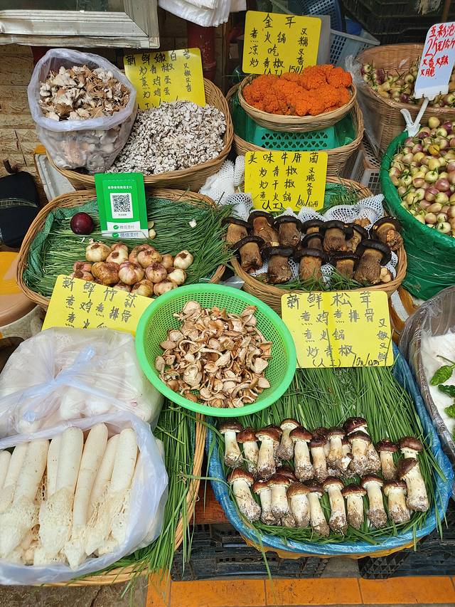 大观篆新市场这些年成了网红菜市场,下午还有点时间就坐车过去了。市场内人潮涌动,网传的米酒、豆花米线、粉蒸肉那几个铺面都排满了人。这个时节正好是野生菌上市的时候,人工培育的菌子在普通蔬菜区明码标价,野生菌交易区常见松茸、干巴菌、青头菌、牛肝菌,鸡油菌等,之前在知乎上看到很多吃了见手青能见小人,内心有点蠢蠢欲动好想试一下馋鲜(错误想法,不要随意采摘or食用野生菌)。对了,在去市场路上经过胜利广场,看到有少数民族在那里跳围圈舞,回来经过时圈子变大、人更多了,在车内都能感受到他们的快乐,下次再去昆明可以考虑参与进去。