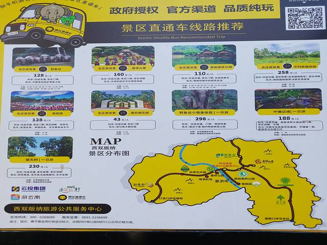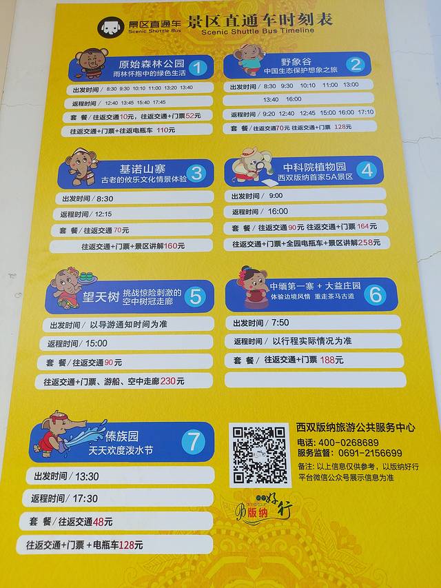 西双版纳到处都是大象、孔雀的形象,一进告庄就看到了直通车的集散点,先去找工作人员了解了下大致的路线、时间,小程序“版纳好行”上即可浏览预定。