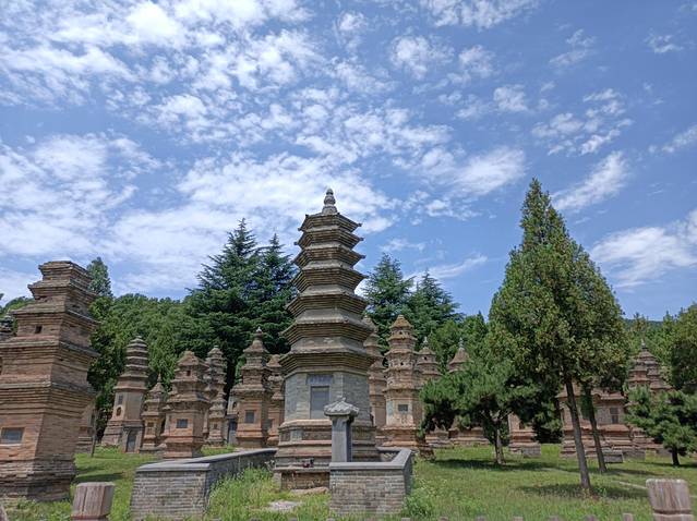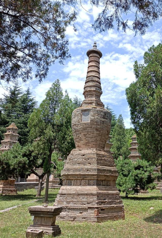 少林寺内成群的古塔密集成林,故称“塔林”。唐至现代的高僧圆寂后的骨灰或舍利会放在地宫里,上面建塔,每座塔都凝结了当时最杰出的技术和文化,反映了当时的社会生活。我和秋秋“蹭了”好几个导游,发现他们只对几个较特殊的高僧进行了介绍。