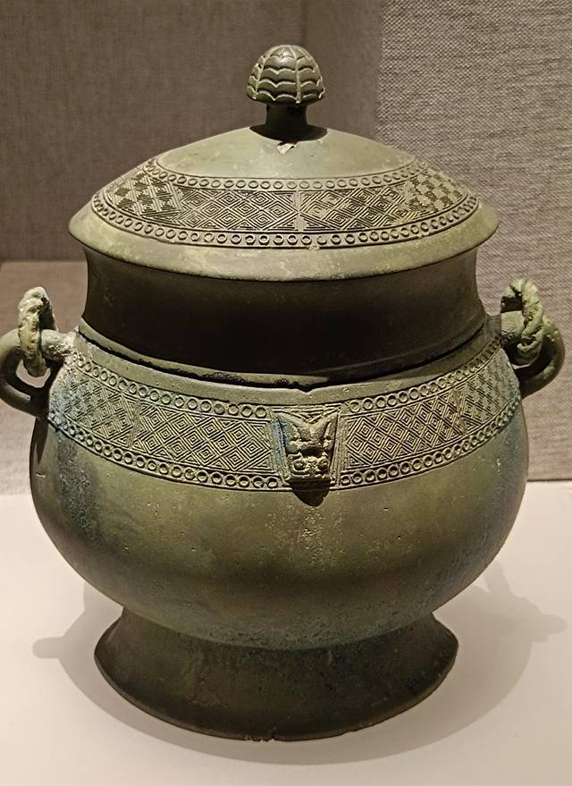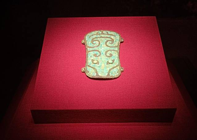 镶嵌绿松石兽面纹铜牌饰,数百颗绿松石镶嵌在铜牌饰上,历经三四千年无一脱落。出土时放在墓主胸部,是二里头文化的镇馆之宝之一。