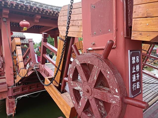 有船通过吊桥底时,吊桥会升起禁止游人通行,无船时会放下让游客正常通行。100%还原了清明上河图里的吊桥!