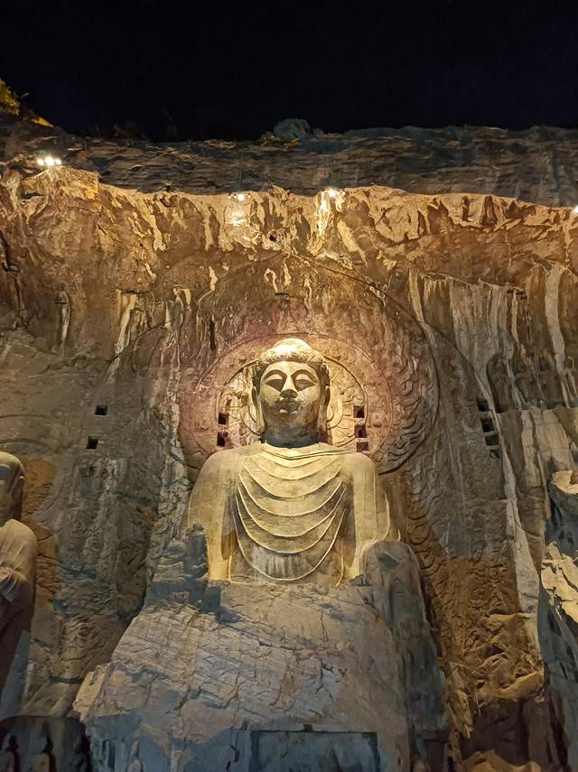 这是龙门石窟最大的一尊佛像“大卢舍那像”,他的附近还有二弟子、二菩萨、二天王及二力士。因为没有拍出比较好的全景,所以单独派了大卢舍那佛像。有巨物恐惧症的人来到这个摩崖像龛可能会有想跪下来的冲动吧。这也是李治时期开始建造的,武则天为它捐助了大量钱财,亲率文武朝臣参加卢舍那的开关仪式。从此民间也流传卢舍那佛依照武皇的面相塑造,是武则天化身。北宋修复龙门佛龛时,在上方修了木结构建筑,想保护佛像不被风吹雨打,但这同时使得佛龛照不到阳光,所以拆除了,但留下了9个梁孔遗迹。