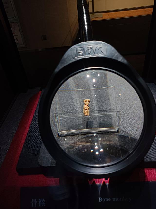 骨猴,用放大镜才能勉强看清,是用动物骨骼雕刻制作的微雕精品。
