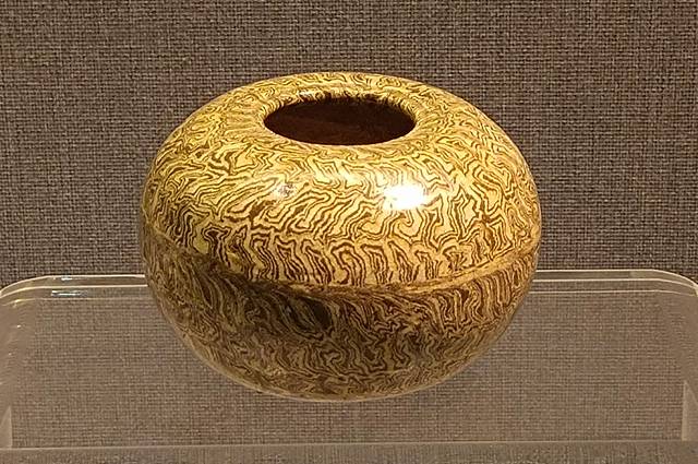 绞胎瓷:由两种不同颜色的瓷土分别制成泥色,然后将他们像麻花一样拧成新的泥料,拉胚成形。绞胎的纹饰千变万化,烧制难度也相对较高。