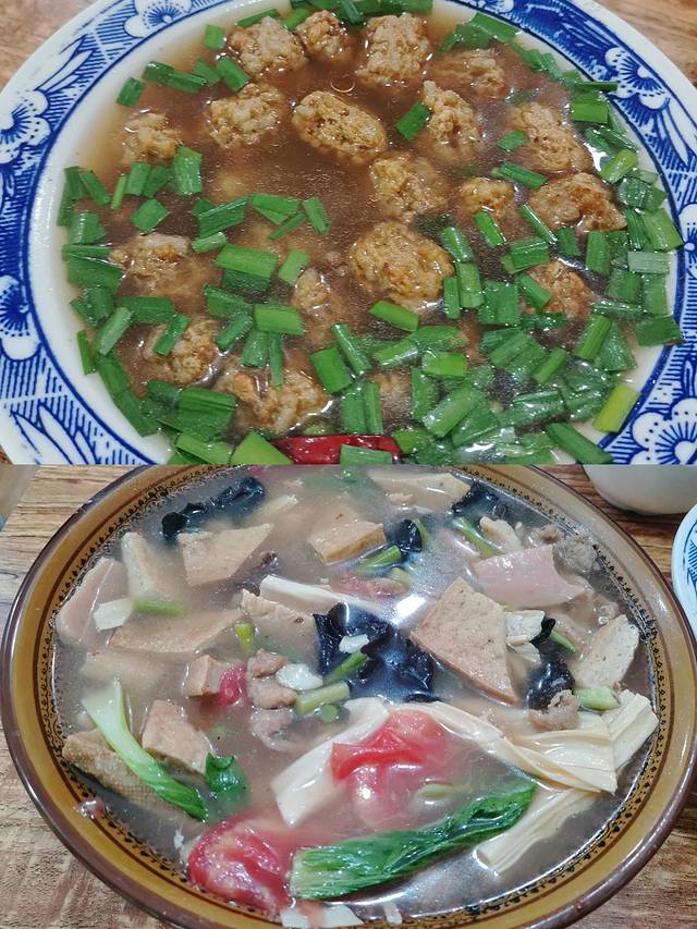 逛完白马寺就在附近随便找了家店吃特色菜。上面为焦炸丸子汤,焦炸丸子和酸辣汤是分开上菜的,然后把汤浇到丸子上,发出滋啦一声。趁热吃丸子外酥里嫩,放冷了丸子吃起来嘎嘣脆,所以叫焦炸。这道菜要抓紧吃,久了丸子浸透酸汁就没那么酥了。下面的具体名字实在想不起来了,和洛阳燕菜比较接近。特色在于外形口感都和豆腐有点接近的肉燕,应该是肉和淀粉做成的,比带肉的王中王火腿肠更嫩滑。