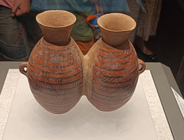 彩陶双连壶,仰韶文化时期陶器,可能为重大活动时部落联盟首领、长者对饮的酒具。