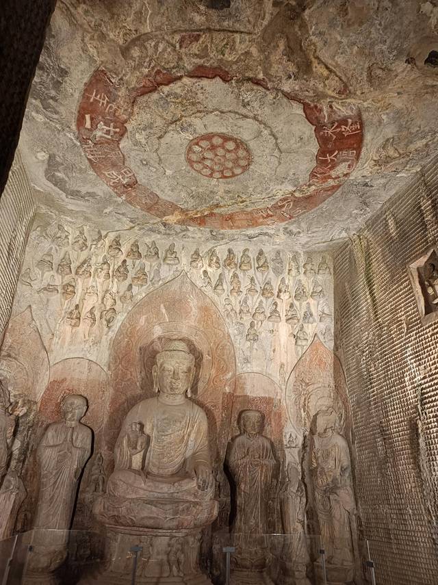 “莲花洞”,因为窟顶雕有硕大的高浮雕莲花而得名,开凿于北魏时期。莲花外还刻有佛的侍者(因为在天上飘逸飞翔,也把这些供养果品和乐舞的天人称为飞天)这里的一摩崖经碑被“伊阙”覆盖,龙门古称“伊阙”是因为伊水从香山和龙门山流过,远望像天然的门阙。杨广曾登邙山远望洛阳南面的伊阙,认为这是天子的门户,在洛阳建起了隋朝的东都。自此,伊阙也被称为龙门。