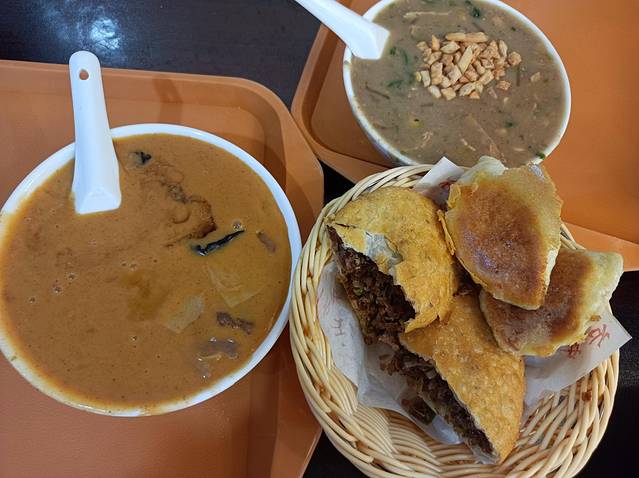 不同于皖北的胡辣汤和山东的撒汤,这家的胡辣汤味道特重,我觉得叫胡辣糊更适合,里面有很多食材:羊肉、粉皮丝、海带丝、油炸豆腐丝......胡椒粉和五香粉特别多。另外一碗是五香豆沫,用小米、花椒和茴香一起调磨成糊状豆汁,然后加进用水煮过的其他食材的汤里,搅拌均匀,比较香。煎包和煎饺胜在酥脆,介于山东的水煎包和江淮地区油煎包之间。三个都是很特别的味道。