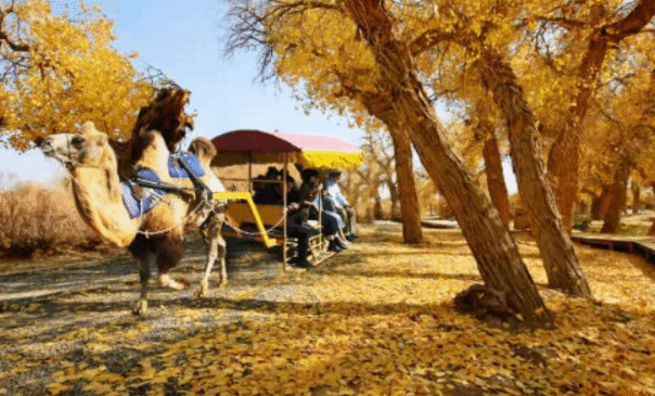 进入景区内,散步在铺满胡杨树叶的路上,轻松又氛围感十足。在路上还有骆驼车,我们可以坐在观光的小火车或者是骆驼车上一路观赏美景。