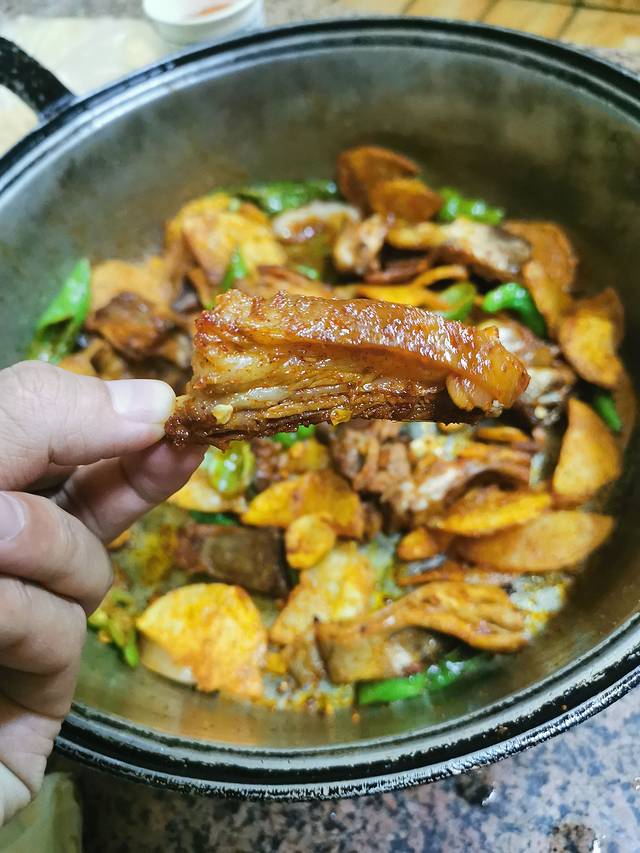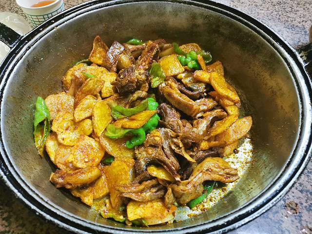 炕锅羊肉,两个人点了一斤羊排,里面有青椒土豆洋葱,这边的羊肉随便怎么做都好吃!