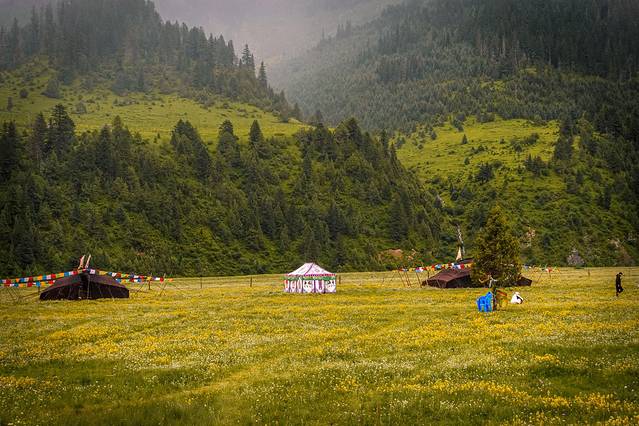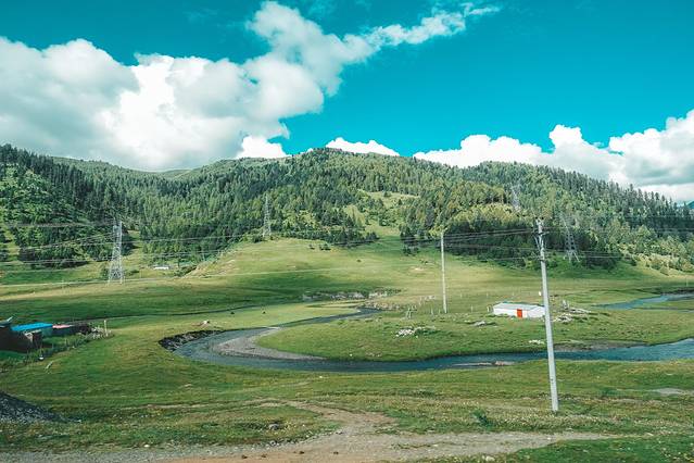 距离 道孚 县65公里的玉科草原,7月的玉科一片绿草茵茵,连绵起伏的山丘, 蓝天、白云、雪山、林木、草原、溪流为一体,被誉为“康巴 阿勒泰 ”。