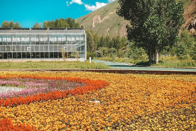 如今来到的时候正值苹果树结果,白色的长廊下,映衬着远处的蓝天白云,来拍照打卡的人们络绎不绝,温室内培育的 木兰 、红景天、报春花等高原特色植物及中草药材。