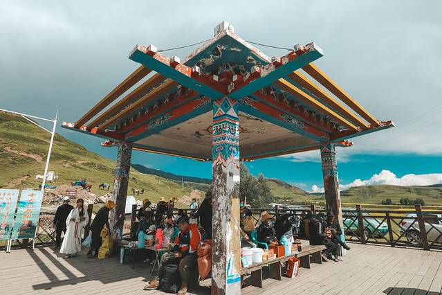 在正式下到墨石公园前有一处凉亭,这里是景区内唯一有卖吃的地方,酸奶、酥油茶等一些简单的食物,如果赶上大晴天,这里也能乘个凉,这边很多牵着马夫的当地人,可以坐马一路下山,免去了徒步的辛苦,如果体力好的还是建议徒步走下去比较好,因为一路下坡,走起来也不累,而且不需要走回头路。